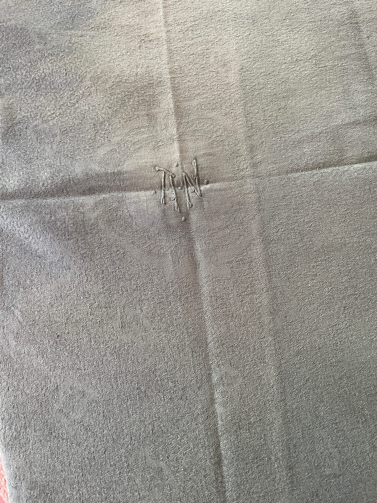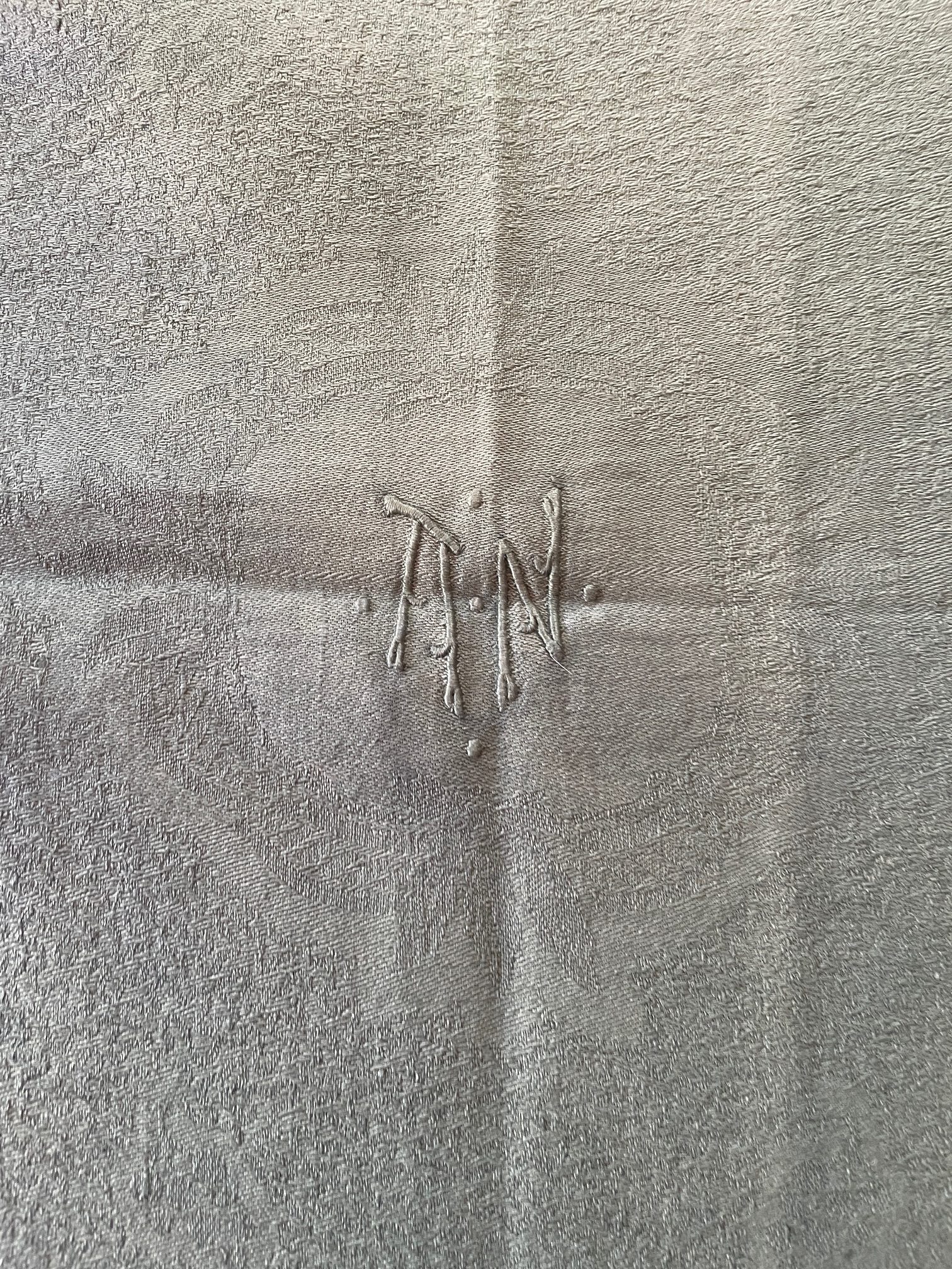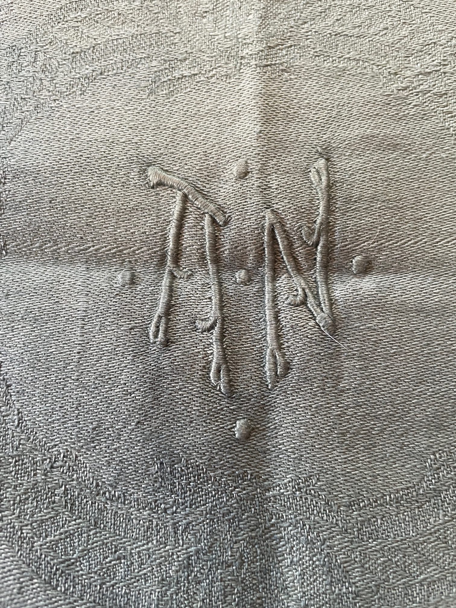 Tovaglia damascata Monogram tinta verde Francia 1900-Nappe damassée Monogramme teintée en vert France années 1900
